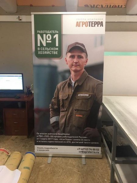 В августе 2017 года для нашего постоянного клиента агрохолдинга Агротерра, наша компания произвела таблички на акриле для производственных помещений с аппликацией и двумя видами пленки. Так же были изготовлены Roll-up для региональных представительств. Вся продукция была произведена на нашем собственном производстве в рекордно сжатые сроки.
