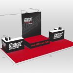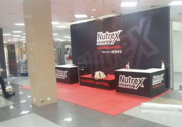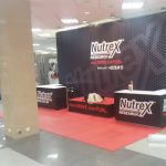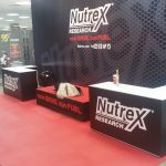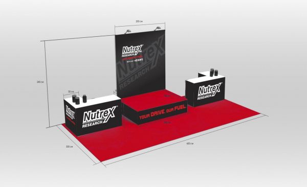 Застройка, выполненная целиком из мобильного оборудования для бренда Nutrex. В конструкции предусмотрена небольшая сцена и промостойки для демонстрации продукции. В день застройки на месте монтажа клиент выяснил, что соседи по выставке ставят большую и не красивую стену, а это портит весь вид стенда. Благодаря опытным монтажникам и быстрому реагированию нашей команды было принято решение увеличить press wall почти в 2 раза прямо на месте проведения.