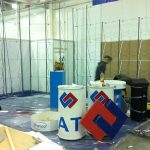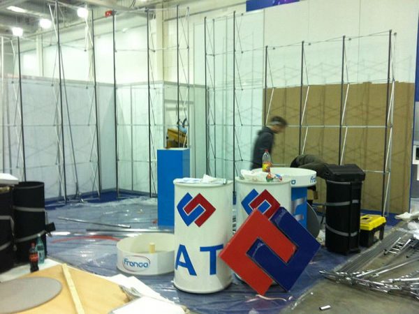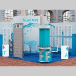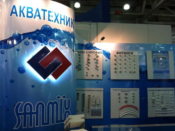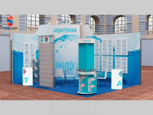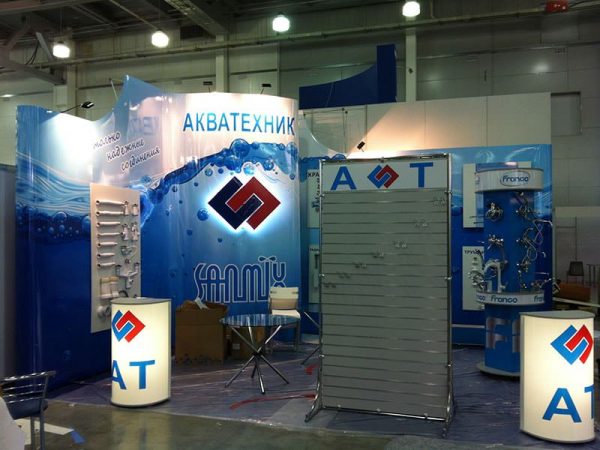 Стенд «Акватехник» — отличный пример застройки, комбинирующей мобильные и стационарные выставочные технологии. Зонтичная конструкция в сочетании с информационными стендами и выкладкой продукции позволила за приемлемую для заказчика цену презентовать продукцию его аудитории.