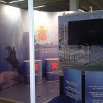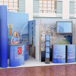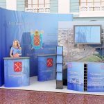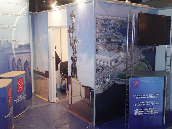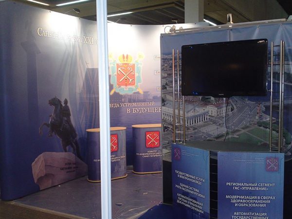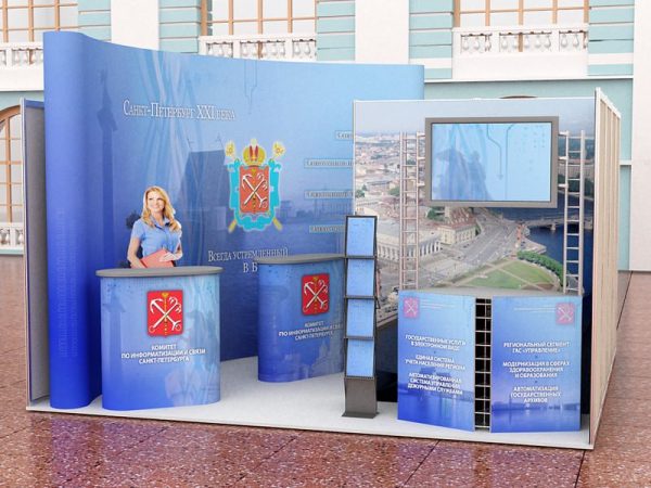 Стенд компании «Инфоцентр» — предельная простота, лаконичность, и, в то же время, функциональность. Стенд предполагает зону ресепшн для промоутеров, плазменный экран для привлечения внимания посетителей выставки, а также подсобное помещение для нужд клиента.