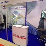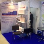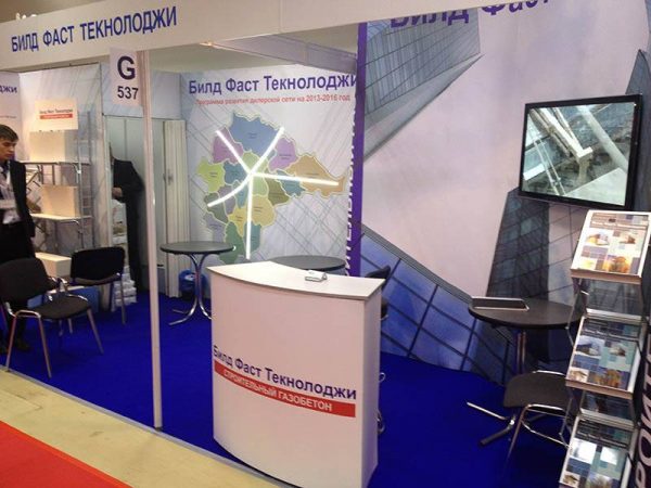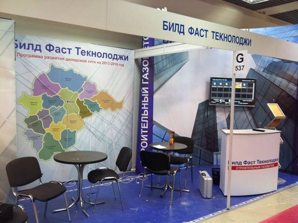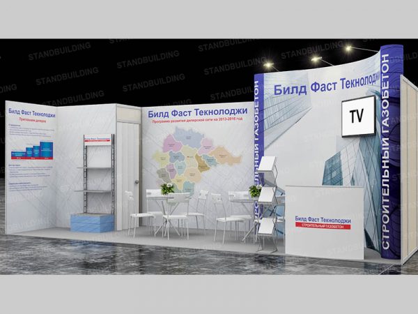 Предельно простой стенд, при этом оборудованный абсолютно всем необходимым для эффективной презентации услуг компании: клиентской зоной, буклетницей, стойкой для выкладки продукции, плазменным экраном и даже небольшим подсобным помещением.