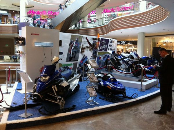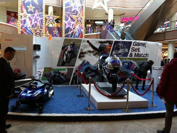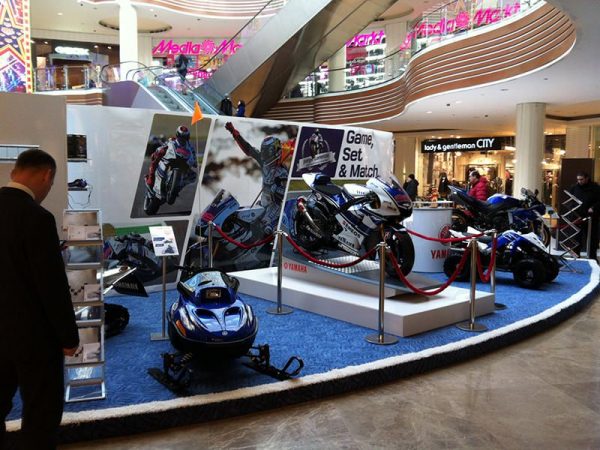 Заказ клиента «Yamaha» — строительство небольшой выставочной зоны прямо на территории ТК «Охотный Ряд». Сжатые сроки, сравнительно небольшая площадь и требования к размещению строго определенного количества единиц техники заказчика были главными сложностями при выполнении нашими специалистами данного проекта.