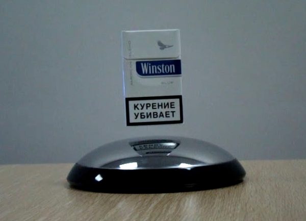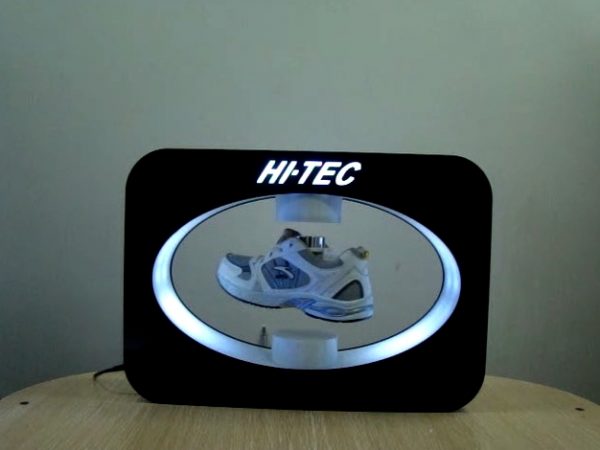 Данная конструкция, или как его называют левитрон, представляет собой антигравитационную площадку с парящей над ней в воздухе магнитной шайбой, на которую можно ставить рекламируемый товар.